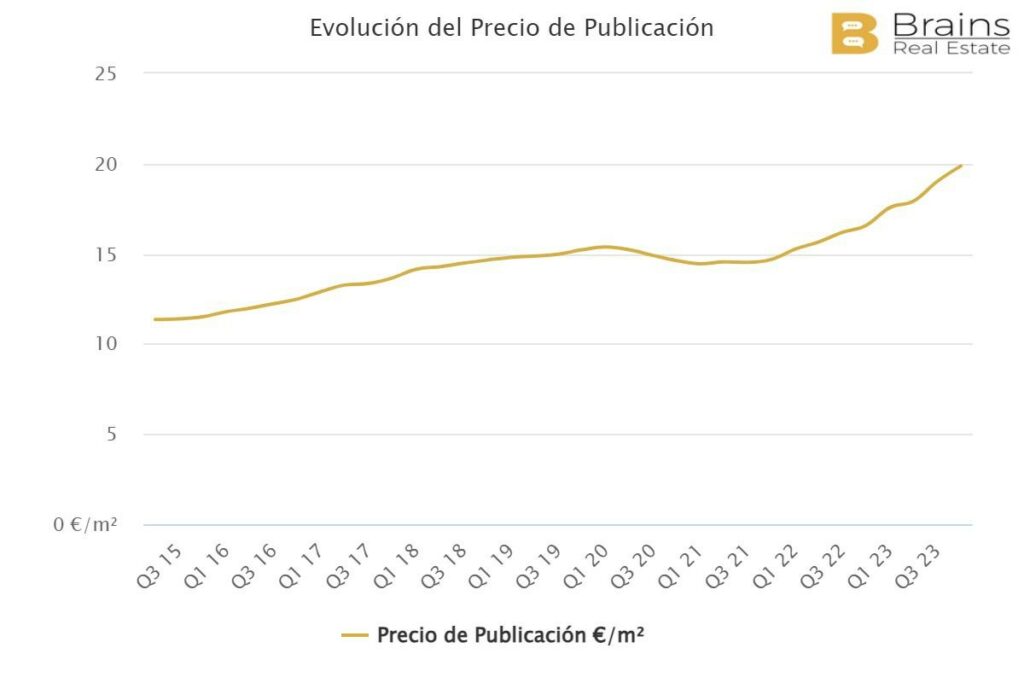 Dans le cas des appartements d’une chambre, le prix est de 1.337€ par mois (23,7€ par m2/mois), et le prix d’achat est de 274.282€. Si nous revenons au prix d’il y a 4 ans, il est descendu à 17,3€/m2/mois, il a donc augmenté de 37%.