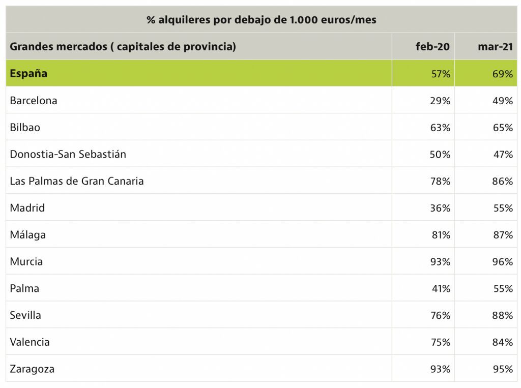 Les baisses du prix de location provoquées par l’augmentation de l’offre subie après le déclenchement de la pandémie et les mois d’enfermement ont fait croître considérablement le poids des logements locatifs en dessous de 750 euros. Si avant la crise sanitaire 34% des logements locatifs annoncés dans les capitales de province avaient un prix inférieur à 750 euros, en mars 2021 ce pourcentage est passé à 42% du total, selon une étude publiée par idealista, analysant la composition de sa location. base de données sur le logement au cours des mois de février 2020 et mars 2021 dans toutes les capitales provinciales espagnoles.(Idealista News)