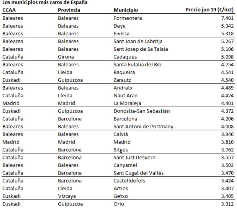 Le podium des 5 communes les plus chères est complété par 4 autres villes des Baléares: Deya (5 342 euros / m2), Eivissa (5 318 euros / m2), Sant Joan de Labritja (5.267 euros / m2) et Sant Josep de Sa Talaia (5.106). euros / m2).