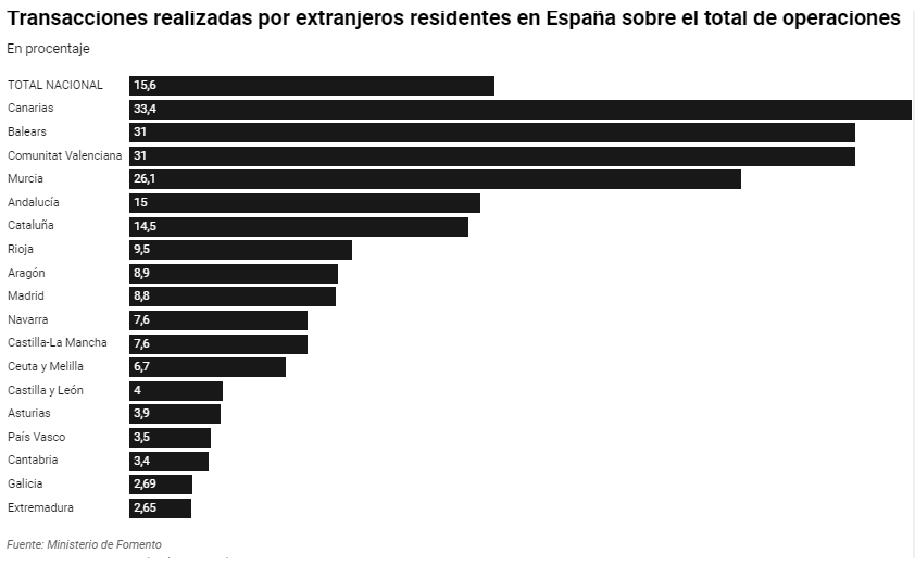 Plus précisément, l’année dernière, il y a eu plus de 580.000 ventes de logements. Sur ce total, 15,6%, soit plus de 90.000 transactions, ont été effectuées par des étrangers résidant dans le pays, selon les données du ministère du Développement. Les principaux pôles d’attraction sont les destinations touristiques. Aux îles Canaries, 33,4% des opérations effectuées au cours de l’année écoulée ont été effectuées par des étrangers résidant en Espagne. Viennent ensuite les îles Baléares et la Communauté valencienne (31%) et la région de Murcie (26,1%).