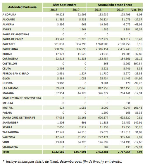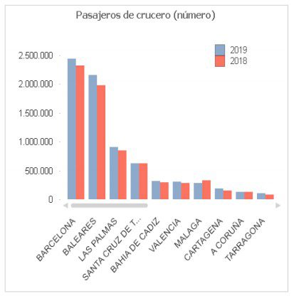 Plus de 2 millions de passagers ont débarqué aux ports de Barcelone et des îles Baléares. On retrouve ensuite ceux de Las Palmas de Gran Canaria, Santa Cruz de Tenerife, et la baie de Cádix.