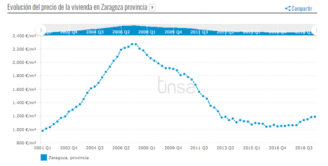 Pour analyser le niveau actuel des prix du logement par rapport à 2001, Tinsa a généré un indice basé sur 1.000 points en 2001. En ce qui concerne cette référence, le prix du logement dans la province de Saragosse s’élève à 1.160 points.