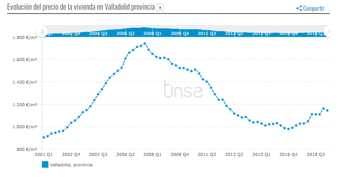 Le prix du logement dans la province de Valladolid a enregistré une croissance de 3,1% d’une année sur l’autre, atteignant 1.142 euros / m². Des valeurs maximales atteintes en 2007, la valeur des appartements dans la région s’est dépréciée de 34,4%. Le marché résidentiel a évolué de manière positive par rapport à 2019. Le prix au deuxième trimestre de 2019 est de 2,9%, un chiffre supérieur à celui enregistré l’année dernière sur la même période.