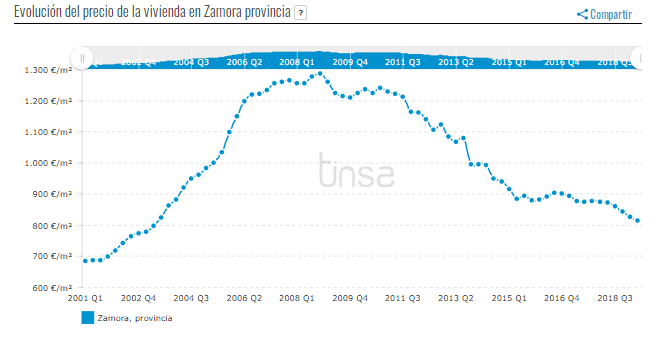 Si nous analysons l’évolution du prix comme s’il s’agissait d’un indice dont le point de départ est l’année 2001 (base 1.000 points), nous constatons que la valeur moyenne du logement au deuxième trimestre de 2019 s’est établie à 1.183 points dans la province de Zamora.