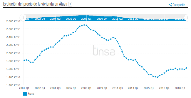 Si nous analysons l’évolution du prix comme s’il s’agissait d’un indice dont le point de départ est l’année 2001 (base 1.000 points), nous constatons que la valeur moyenne du logement au deuxième trimestre de 2019 était de 899 points dans la province. de Álava.