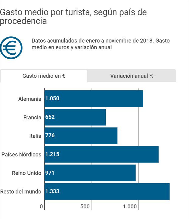 Les touristes nordiques dépensent le plus pour leurs voyages en Espagne, avec une moyenne de 1 215 euros, suivis par les touristes allemands, avec une moyenne de 1 050 euros.