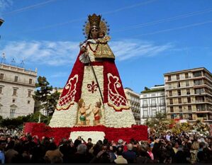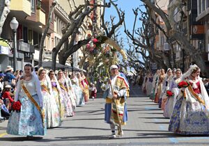 La OFRENDA est l’autre grand moment des Fallas, avec pendant deux jours le défilé incessant de toutes les Falleras et Falleros en habits traditionnels, environ 100 000, qui viennent fleurir une immense vierge en bois placée au centre de la Plaza de la Virgen. Cette procession se fait avec recueillement, mais également au son des bandes musicales.