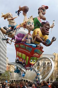 Commençons cet article de vulgarisation avec le terme FALLA : une Falla désigne à la fois l’œuvre artistico-satirique qui se trouve répartie dans toute la ville de Valencia, et les villages avoisinant (il y en a 700 au total !) mais aussi le groupe de voisins et amis (los Falleros y Falleras) qui toute l’année se réunit pour préparer ces festivités au sein d’un CASAL, lieu de regroupement. Ces immenses personnages tout en couleurs sont en polystyrène et constituent un musée à ciel ouvert et éphémère puisque toutes ces créations finiront brûlées le soir du 19 mars (c’est la Crèma) excepté un personnage qui sera “sauvé” et qui rejoindra le fameux musée des Ninots.