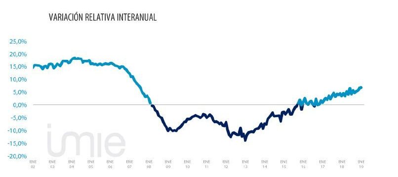 L’indice Tinsa IMIE General, qui reflète l’évolution de la valeur moyenne des logements finis (neufs et d’occasion) en Espagne, a enregistré une augmentation d’une année sur l’autre de 6,8% en janvier; cette variation est supérieure de trois dixièmes à celle de décembre 2018. En valeur annuelle, ce sont la côte méditerranéenne, les capitales et les grandes villes qui ont enregistré la plus forte appréciation (10,1% et 9,0%, respectivement), tandis que les municipalités situées à l’intérieur de la péninsule ont enregistré des prix nettement inférieurs (1,5%). Les zones métropolitaines et les territoires insulaires affichent des chiffres proches de la moyenne nationale, proches de 7%. En termes de variation mensuelle de la valeur, les zones métropolitaines de janvier se distinguent, avec une variation de pratiquement 2% par rapport à décembre 2018, reflétant le transfert des hausses de prix du centre des grandes villes à sa périphérie, après des années de hausse notable des prix dans les principaux districts. Les îles Baléares et Canaries, avec une augmentation mensuelle de 1,6%, présentent également des variations importantes. Le reste des zones géographiques ont enregistré des augmentations plus modérées, entraînant une augmentation mensuelle de 0,8% dans l’ensemble de l’Espagne.