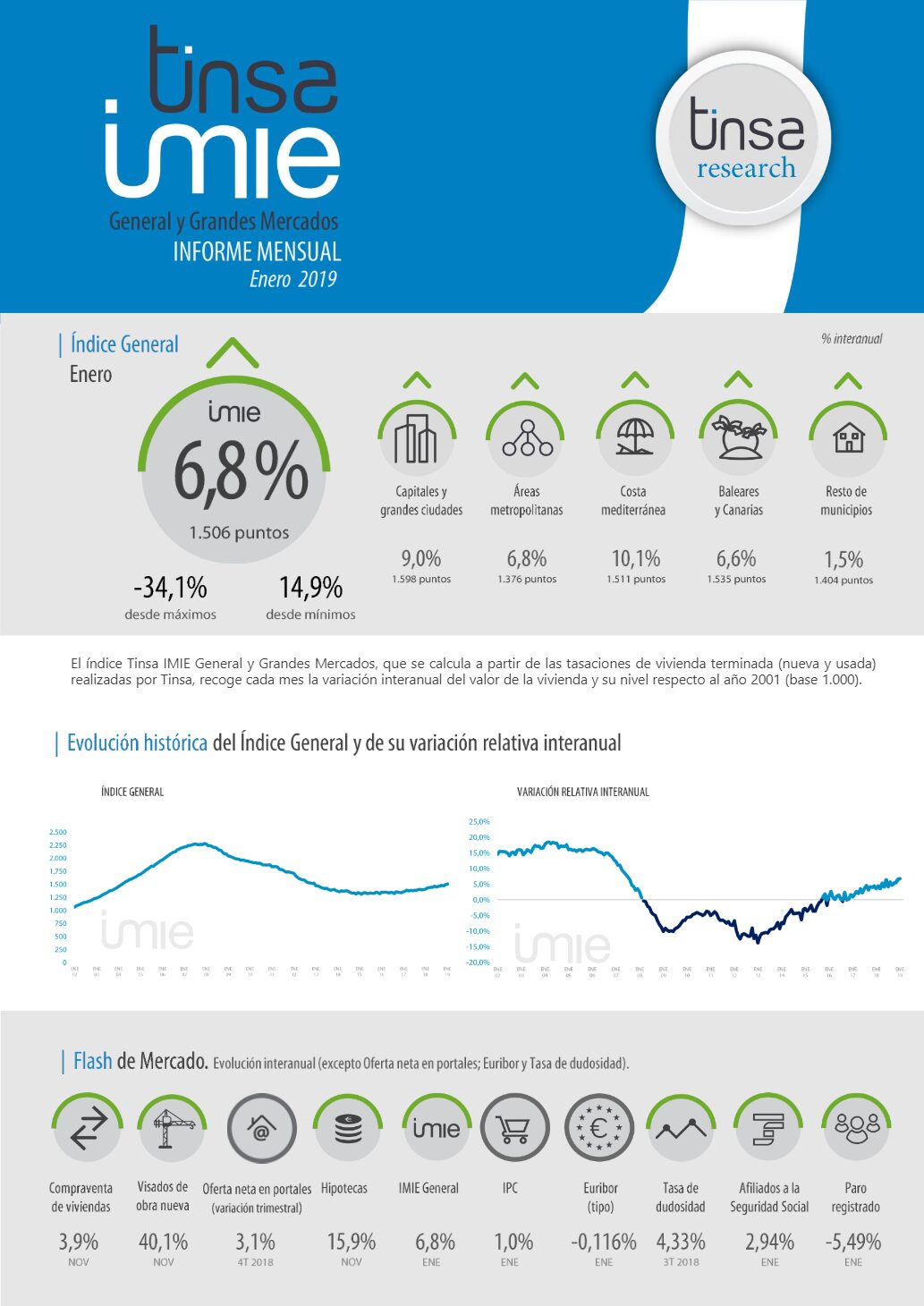 L’indice Tinsa IMIE Général et Grands marchés comprend une sélection d’autres indicateurs économiques et immobiliers pertinents pour analyser l’évolution et les perspectives du secteur résidentiel. Voici, le flash du marché avec les dernières données disponibles à ce jour.