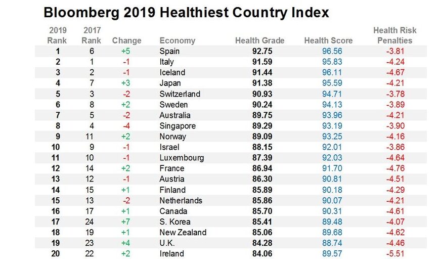 L‘édition 2019 du Bloomberg Healthiest Country Index, classe 169 économies selon des facteurs liés à la santé en général. L’Espagne qui était classé sixième pays le plus sain à l’occasion de l’édition précédente en 2017,  est cette année en tête du classement.