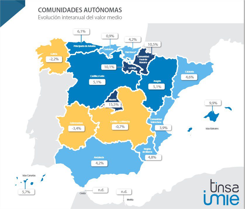 L a capitale de Madrid a été réévalué de 41,8% et Barcelone de 48,8% depuis qu’ils ont touché leurs minimums respectifs pendant la crise. Le logement fini (neuf et usagé) à Madrid est 18,9% plus cher qu’il y a un an et se distingue par la plus forte augmentation interannuelle des capitaux au deuxième trimestre, suivi par Malaga (+ 15,8%) et Palma de Majorque (+ 12,9%). Ils ont également enregistré des augmentations de plus de 6% au cours des 12 derniers mois Pampelune *, Valence, Castellón, Logroño, Valladolid, Grenade, León, Huelva et Bilbao.