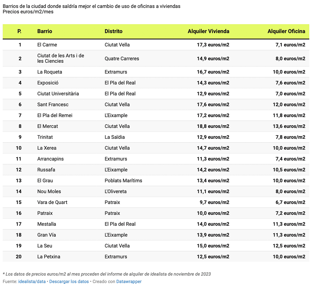 Dans la ville de Valence, les quartiers du centre de la capitale sont ceux qui susciteraient le plus d’intérêt pour un changement d’usage de bureaux en logements, avec notamment Carme, Sant Francesc ou El Mercat à Cuitat Vella ; Exposició et Ciutat Universitària, à El Pla del Real, ou encore La Roqueta, à Extramurs.