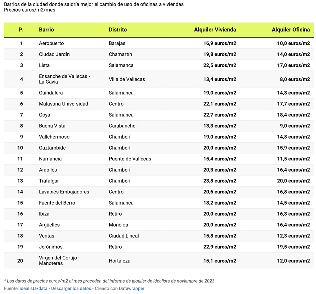 Dans la ville de Madrid, les 1ers quartiers qui se distinguent sont Aeropuerto, dans le district de Barajas, et Ciudad Jardín, à Chamartín, suivis de Lista, à Salamanca, et Ensanche de Vallecas – La Gavia, à Villa de Vallecas. Ces 4 quartiers illustrent clairement la diversité des zones où il peut être rentable de passer d’un usage de bureaux à un usage résidentiel, tant dans les zones centrales qu’à l’extérieur du noyau central du périphérique M-30 de Madrid.