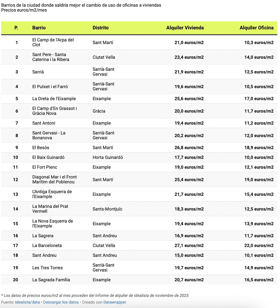 Les quartiers d’El Camp de l’Arpa à Clot de Sant Martí, et de Sant Pere – Santa Caterina i la Ribera à Ciutat Vella sont les zones où le changement d’usage de bureaux en logements serait la meilleure option. Avec des prix de location supérieurs à 20€/m2 par mois, le coût de location des bureaux se situe entre 10 et 14€/m2 respectivement.