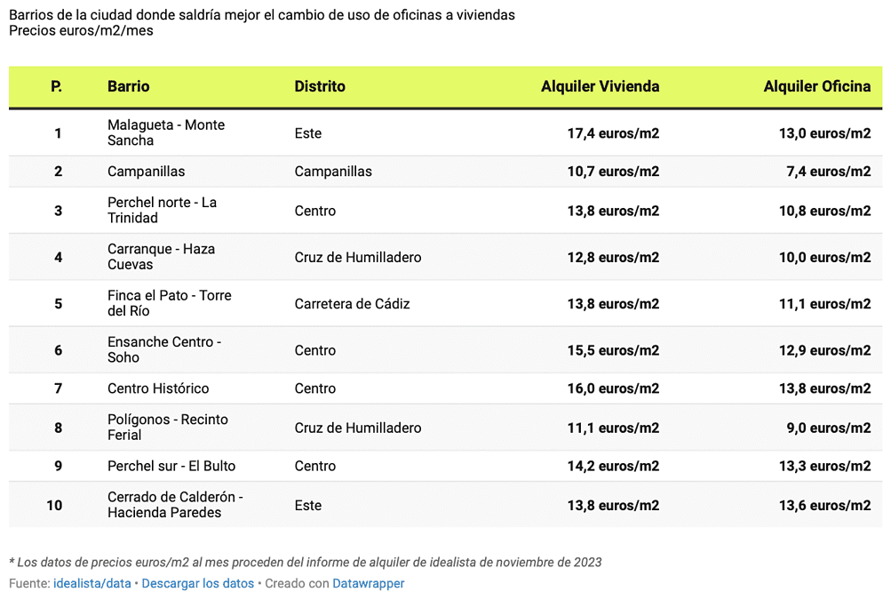 Enfin, dans la ville de Malaga, les quartiers où il pourrait y avoir le plus d’intérêt pour un changement d’usage de bureau à résidentiel seraient les zones les plus centrales telles que Malagueta-Monte Sancha, Perchel Norte – La Trinidad ou Ensanche Centro – Soho.