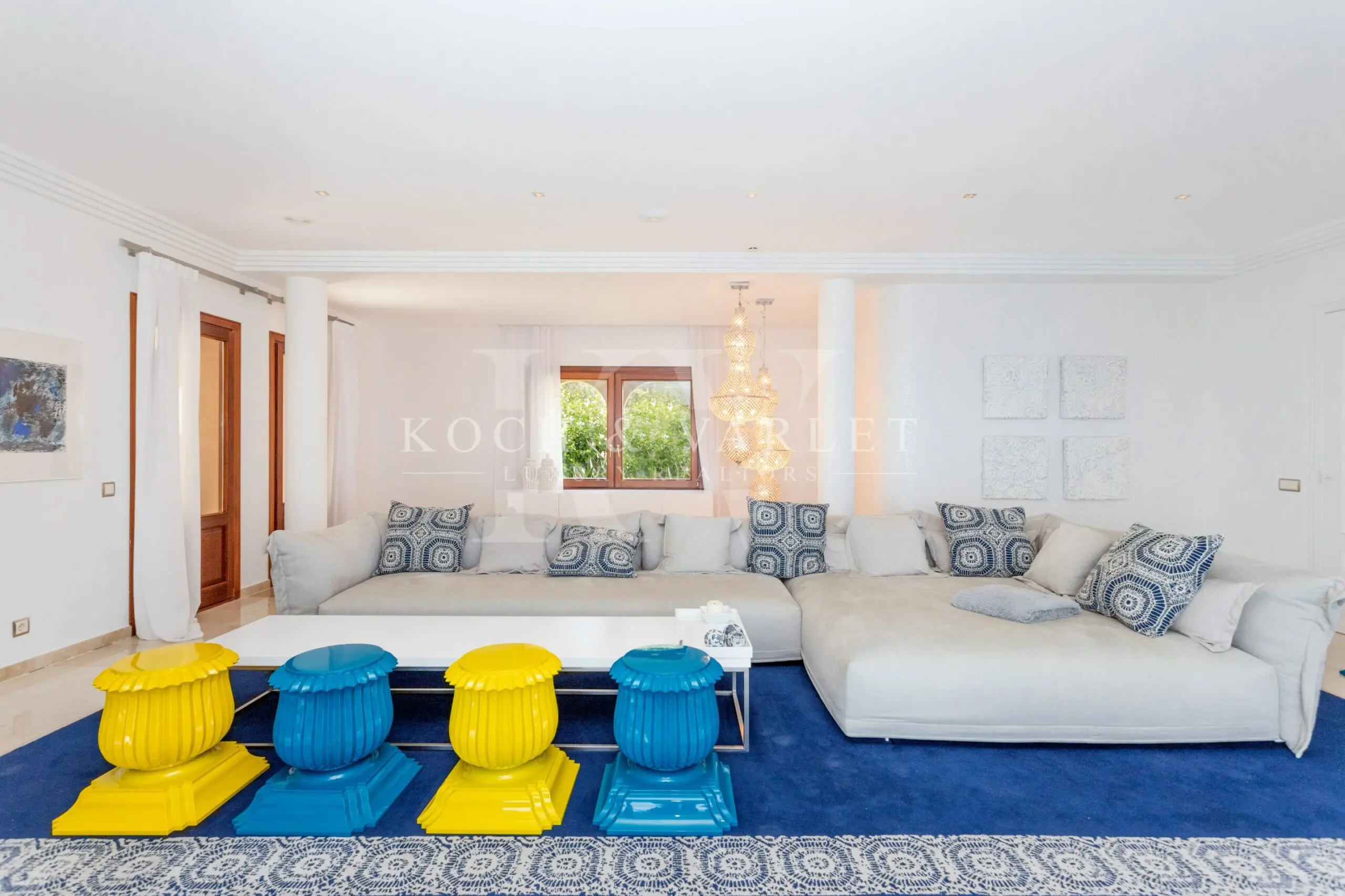 Une villa aux dimensions exceptionnelles, composée de 10 chambres et 12 salles de bains. Répartie sur deux étages, elle dispose de deux grandes piscines, 2 bureaux, 3 salons, une salle de sport privée, un double garage, une cuisine entièrement équipée, un bar extérieur, un appartement privé ainsi que de grandes terrasses ensoleillées et des espaces couverts.