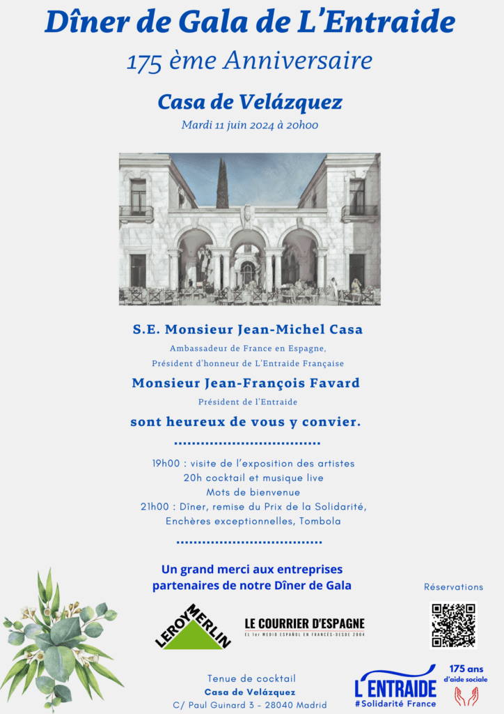 L’Entraide française à Madrid célèbre le 11 juin prochain son traditionnel Dîner de Gala sur la splendide terrasse de la Casa de Velázquez. Cette année, la célébration aura un caractère historique : l’association commémore les 175 ans écoulés depuis sa fondation par Ferdinand de Lesseps. La Société Française de Bienfaisance -son nom initial- a donné naissance à des institutions madrilènes aussi importantes que le Lycée Français, l’Institut Français, ou le foyer pour personnes âgées Saint Louis des Français. C’est sans aucun doute l’une des associations françaises les plus anciennes de la péninsule ibérique. Elle s’est maintenue active et a su s’actualiser au fil des années. L’Entraide continue de soulager la vie de beaucoup de personnes et familles françaises ou binationales et qui, pour une raison ou une autre, connaissent la grande précarité. Elle aide des personnes âgées, d’autres qui ne peuvent plus exercer une profession et beaucoup de familles monoparentales.