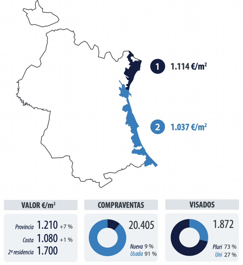 Le prix des résidences secondaires est entre 30 et 70 % plus élevé que celui des résidences principales. Les maisons de vacances coûtent en moyenne 1 400 €/m2 en typologie unifamiliale et 1 800 €/m2 en typologie multifamiliale. La valeur moyenne des logements généraux dans les municipalités côtières de Valence est de 1 080 €/m2.