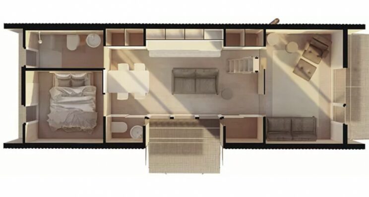 La conception de ce Mohma peut être personnalisée et le salon peut être remplacé par un bureau, ou l’une des chambres par une bibliothèque. C’est un modèle idéal pour planifier de longues escapades familiales à la campagne.