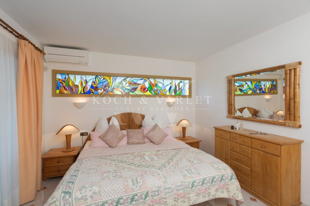 Comme tout dans cette propriété, les aménagements extérieurs sont d’une qualité extraordinaire, avec élégance et simplicité à la fois. L’imposante maison de conception architecturale moderniste, a à l’intérieur, un grand salon avec cheminée et vue imprenable sur la mer Méditerranée, une cuisine moderne et équipée, 4 grandes chambres doubles avec terrasses extérieures et 6 salles de bains. Nous soulignons les détails architecturaux de la maison, tels que la double hauteur du hall d’entrée, orné d’un mur en pierre naturelle et de détails en mosaïque.