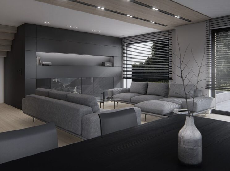 La maison de 205 m2 est distribuée en trois chambres et trois salles de bain, une cuisine, un salon-salle à manger spacieux et un garage pouvant accueillir deux voitures. Elle dispose de grands espaces extérieurs étroitement liés à l’intérieur de la maison.