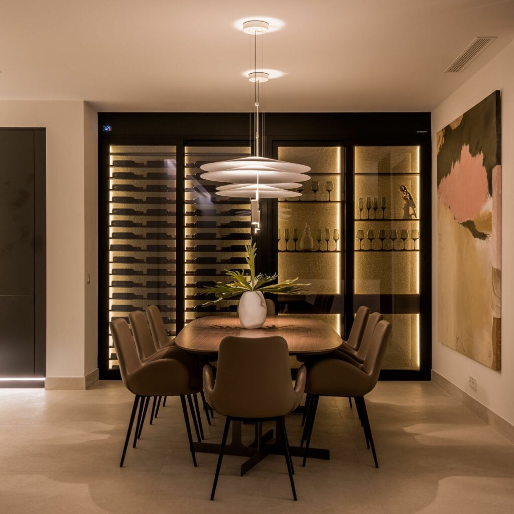 Hall d’entrée, salon-salle à manger avec cuisine ouverte entièrement équipée, cave à vin, trois chambres en suite. Accès direct à la terrasse couverte.