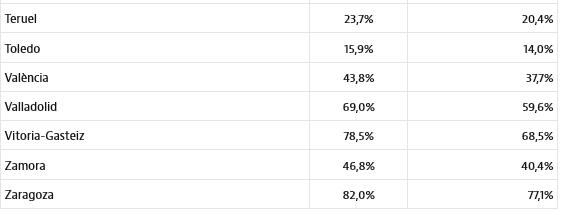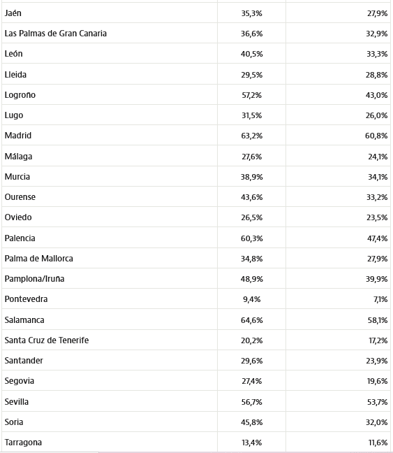 Aujourd’hui, l’importance de la capitale est passée de 82 % à 77,1 % à Saragosse, de 41 % à 35,5 % à Bilbao et de 43,8 % à 37,7 % à Valence. Parmi les principaux marchés, Palma (de 34,8 % à 27,9 %) et Valladolid (de 69 % à 59,6 %) suivent.