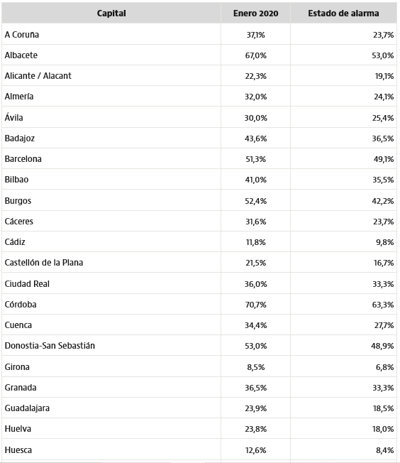 Sur le marché pré-pandémique, 44,1 % des recherches de logement dans notre pays ont eu lieu dans les capitales provinciales. Au contraire, depuis que l’état d’alerte a été décrété, ce pourcentage a été ramené à 38,8 %.