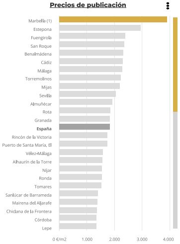 En Andalousie, les endroits les plus chers pour acheter un logement se trouvent principalement sur la Costa del Sol, à savoir Marbella, Estepona (Málaga), Fuengirola (Málaga), San Roque (Cadix) et Benalmádena (Málaga).