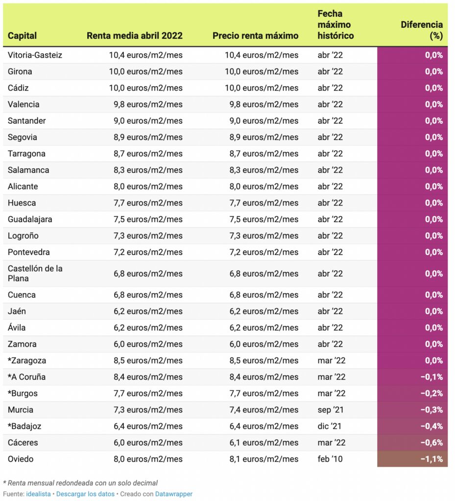 Vitoria (10,4 € par mois/m2), Alicante (8 €), Ávila (6,2 €), Cadix (10 €), Castellón de la Plana (6,8 €), Cuenca (6,8 €), Gérone (10 €) , Guadalajara (7,5 €), Huesca (7,7 €), Jaén (6,2 €), Logroño (7,3 €), Pontevedra (7,2 €) , Salamanque (8,3 €), Santander (9 €), Ségovie (8,9 €), Tarragone (8,7 €), Valence (9,8 €) et Zamora (6 €). Dans toutes ces villes, le revenu locatif moyen a battu des records en avril 2022.