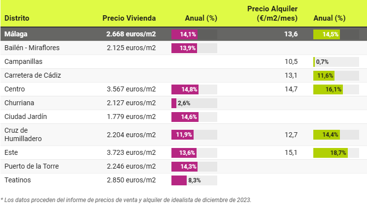 Les quartiers d’Este et de Centro à Malaga ont connu les prix les plus élevés tant à l’achat qu’à la vente, avec respectivement 3.723€/m2 et 3.567€/m2, qu’à la location, avec 15,1€/m2 par mois et 14,7€/m2, chacun. Bien plus que la moyenne de la ville (2.668€/m2) à la vente, et 13,6€/m2 à la location.