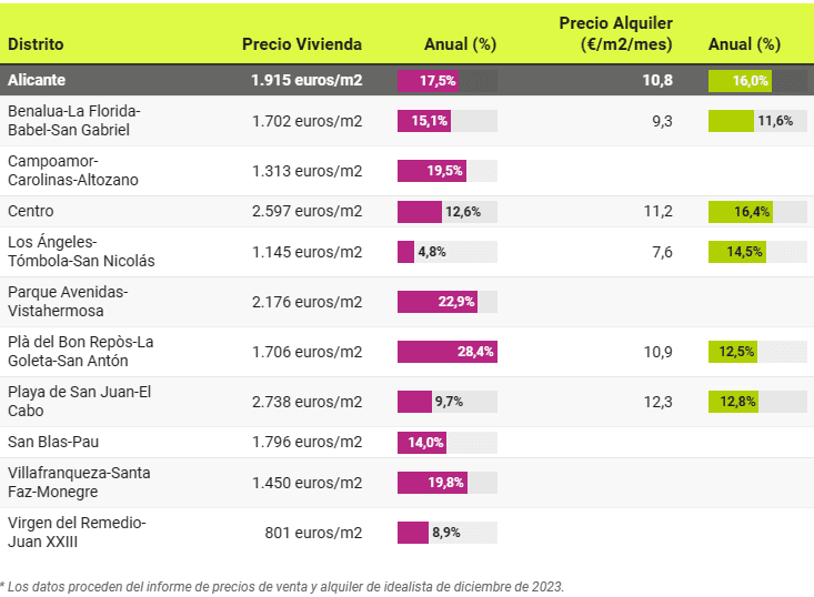 Les principales hausses de prix ont été enregistrées à Plà del Bon Repòs-La Goleta-San Antón (28,4%), Parque Avenidas-Vistahermosa (22,9%), ainsi que dans d’autres zones qui n’ont pas atteint de maximum comme Villafranqueza-Santa Faz-Monegre (19,8%) ou Campoamor-Carolinas-Altozano (19,5%).