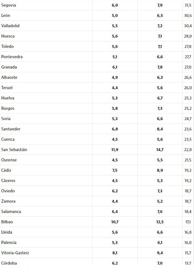 Mais d’autres villes, telles que Castellón (16,7 %), Pampelune (10,4 %), Gérone (11,5 %) ou Murcie (10,3 %) déjà mentionnées, ont connu des augmentations à deux chiffres.