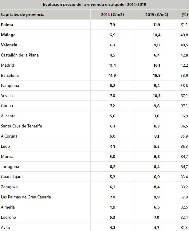 A cela, il faut ajouter les 10 capitales ayant connu les plus fortes hausses de loyers sur la période 2014-2019 : Pampelune (38,6 %), Séville (37,9 %), Gérone (37,5 %) et Alicante (36,9 %). Dans d’autres grandes villes où le leasing a un poids important, les augmentations ont également dépassé 30 %, comme à Murcie (34,7 %), Saragosse (33,2 %) et Las Palmas de Gran Canaria (32,9 %).