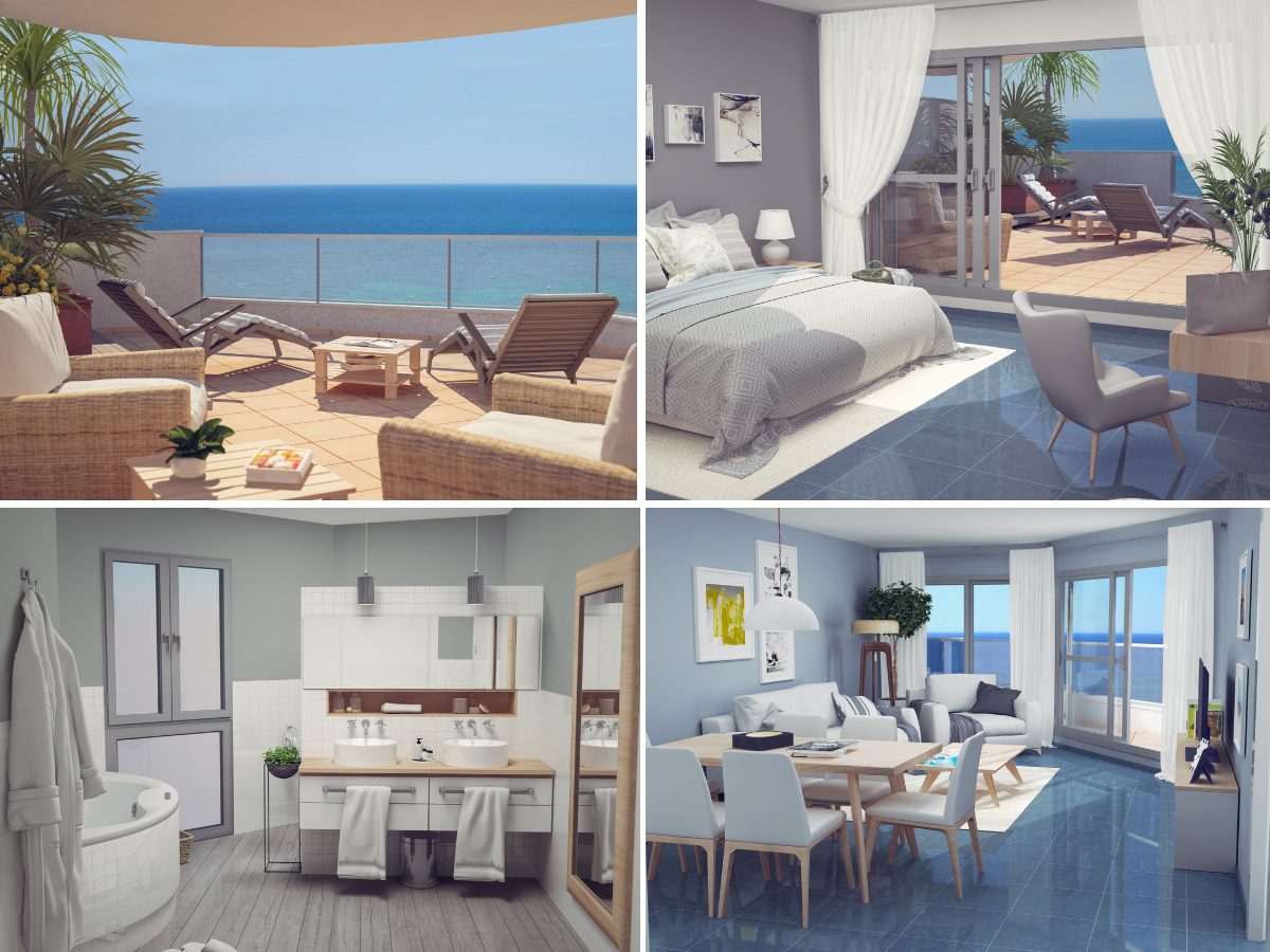 Magnifique attique duplex situé au dixième étage de l’immeuble Hipocampos en première ligne de la plage de Levante. Il possède une superficie totale de 327 m2 dont 165m2 correspondent à la superficie construite, 19m2 aux terrasses couvertes et 143m2 aux terrasses découvertes avec vues.