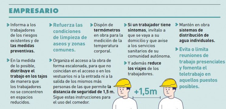 Parmi les mesures destinées aux entreprises, deux se distinguent. La première concerne l’arrivée des salariés sur leur lieu de travail. Elle stipule d’organiser l’accès aux travaux de manière échelonnée afin qu’il n’y ait pas plus de personnes à l’entrée ou à la sortie des vestiaires que la distance de sécurité d’un mètre et demi ne le permet. La deuxième mesure concerne l’utilisation de la salle à manger -si tant est qu’il y en ait-. Dans cette optique, elle invite les employeurs à répartir leurs employés sur l’ensemble du chantier – dans la mesure du possible – afin qu’ils ne se concentrent pas dans des espaces réduits.