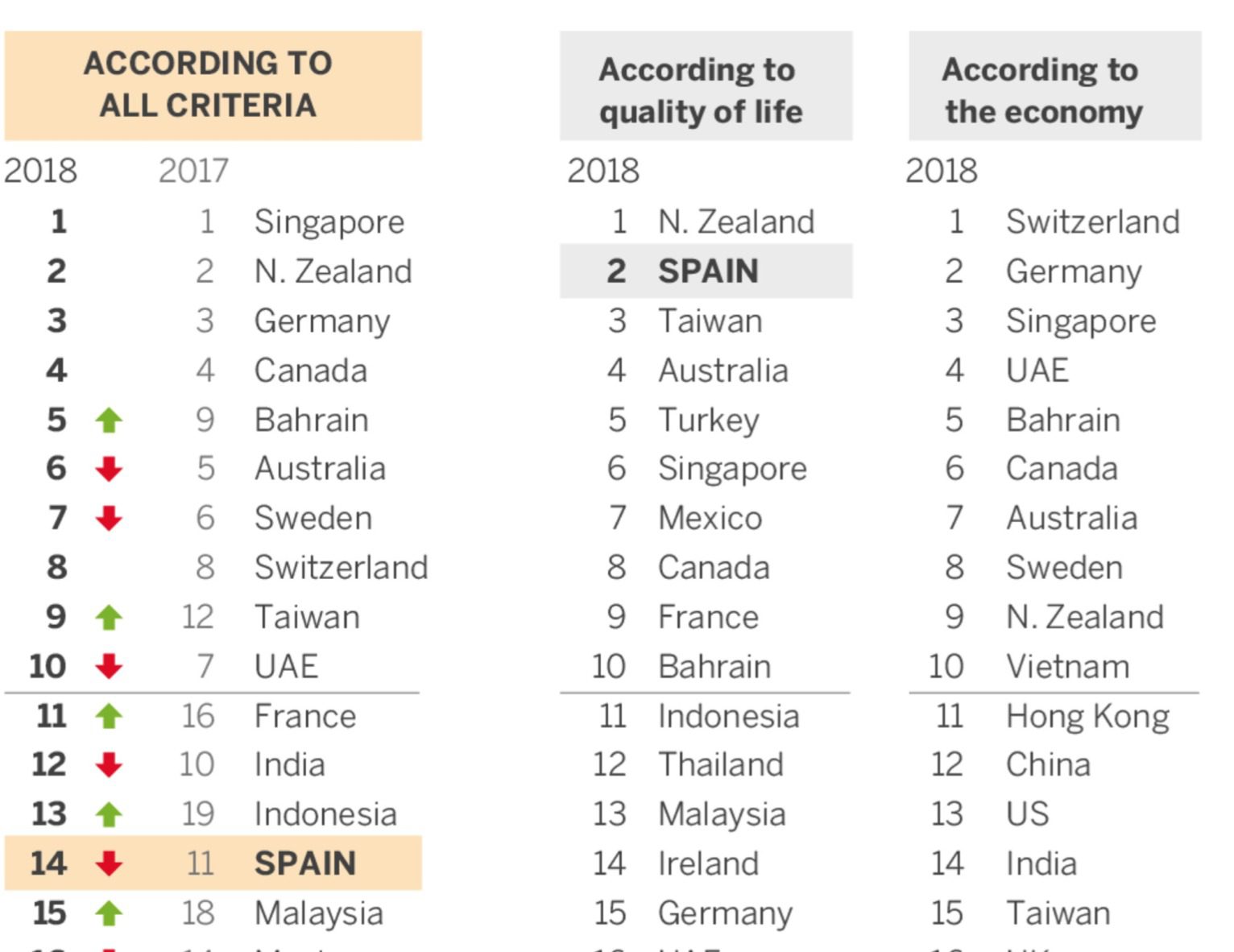 Tous critères confondus, l’Espagne, occupe la 14e position, la France la 11e et en queue de peloton, c’est le Japon qui termine bon dernier sur la liste des 30 pays examinés. Concernant les conditions économiques, l’Espagne occupe la 27e place (la France est seulement 21e) mais occupe la deuxième place en ce qui concerne la qualité de la vie.