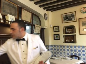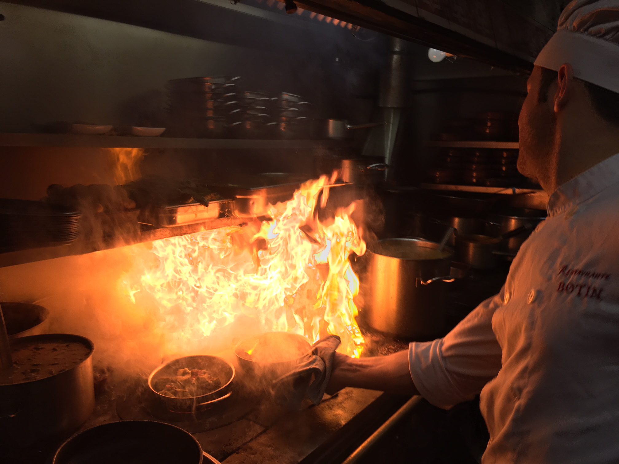 Synonyme de bonnes maisons à Madrid, le personnel est habillé à l’ancienne : chemise blanche et nœud papillon noir. Nous vous recommandons de vous installer au rez-de-chaussée, dans une petite pièce seulement accessible par les cuisines. Traverser le cœur de la maison Botín est une véritable expérience et un spectacle incroyable. Une dizaine de chefs s’activent à préparer les « cochinillos », les « corderos », les « croquetas », tout ce que l’Espagne fait de mieux. À la différence de nombreux restaurants, vous pouvez voir l’activité des cuisines à travers une vitre, comme si vous y étiez. Le jour où nous y sommes allés, le cuisinier ne manquait pas de flammes…