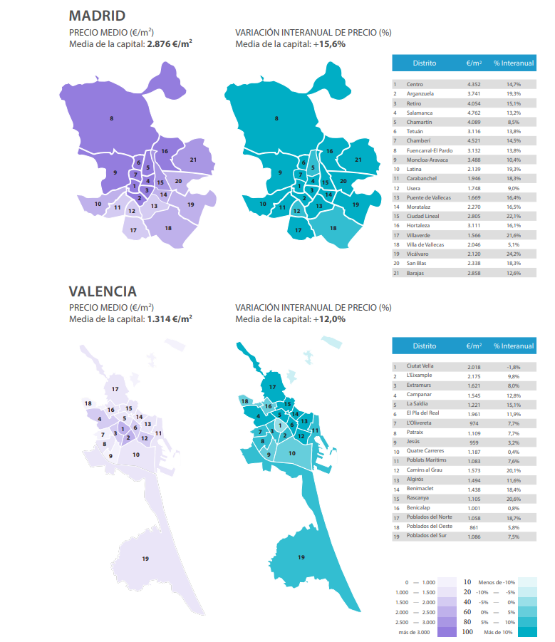 Après les districts de Madrid, les plus fortes augmentations interannuelles parmi les cinq plus grandes villes espagnoles sont les Valenciens de Rascanya (+ 20,6%) et Camins al Grau (+ 20,1%). La ville de Valence a établi la récupération des valeurs dans la plupart de ses districts. Les zones les moins dynamiques de la dernière année de la capitale du Turia sont Ciutat Vella (-1,8%), Quatre Carreres (+ 0,4%) et Benicalap (+ 0,8%).