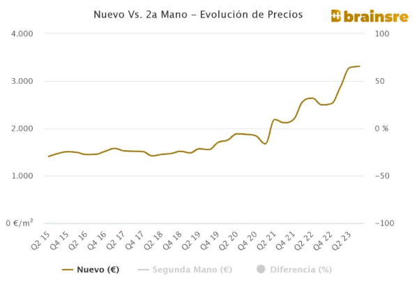 Actuellement, le prix des logements neufs dans la ville de Rincón de la Victoria s’élève à 3.309€ par m2, ce qui représente une augmentation de 32,5% en rythme annuel et de 0,7% en comparaison trimestrielle, selon les données de la plateforme de big data immobilière Brains Real Estate.