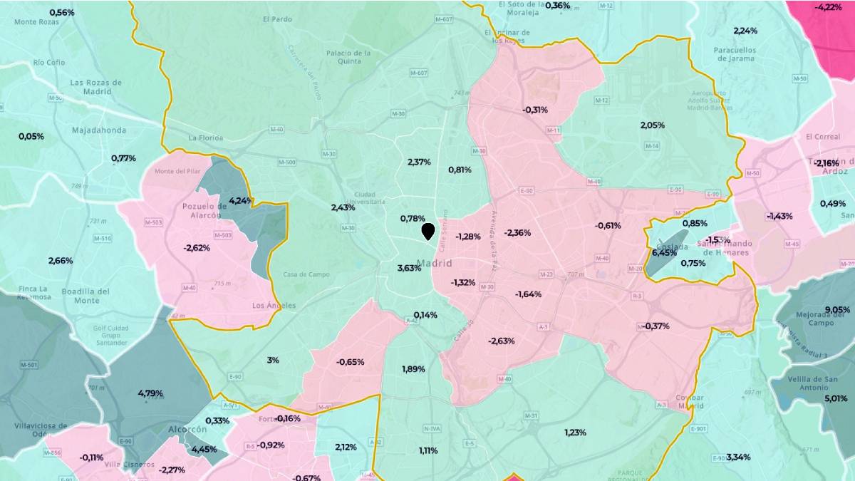 Cependant, cette augmentation n’a pas été la même dans toutes les zones de Madrid. En effet, alors que dans certains quartiers comme Centro, Latina, Moncloa-Aravaca, Tetuán et Barajas, le prix des logements a augmenté de plus de 2% d’un trimestre à l’autre, il a baissé dans neuf autres.