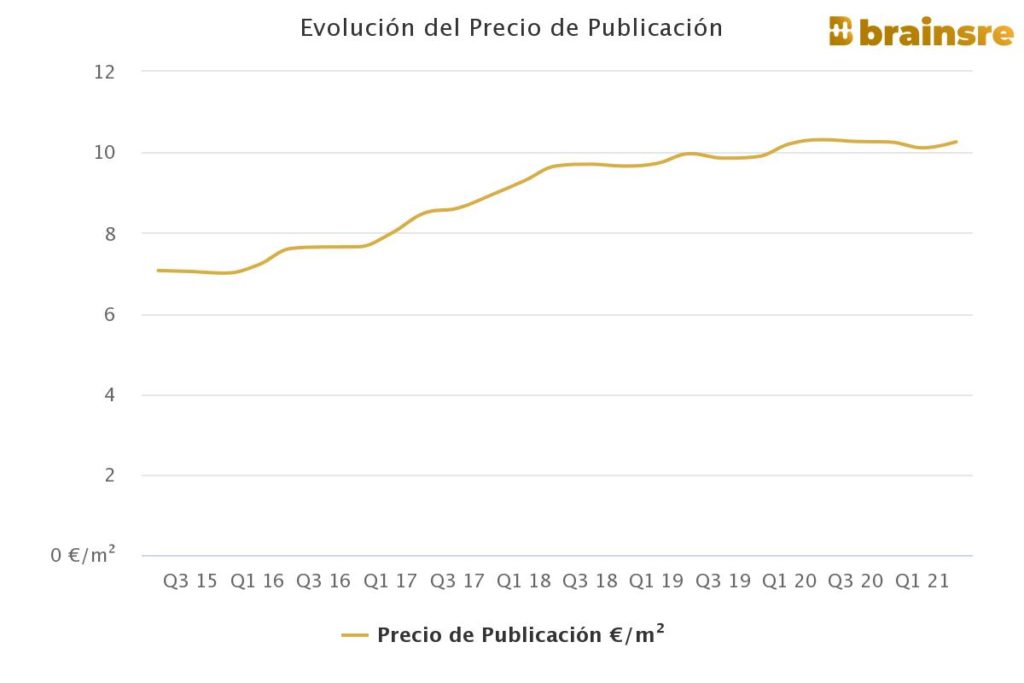 Au cours des quatre derniers trimestres, le prix du mètre carré s’est stabilisé autour de 10 €, selon les données extraites de la plateforme de big data immobilière Brainsre.