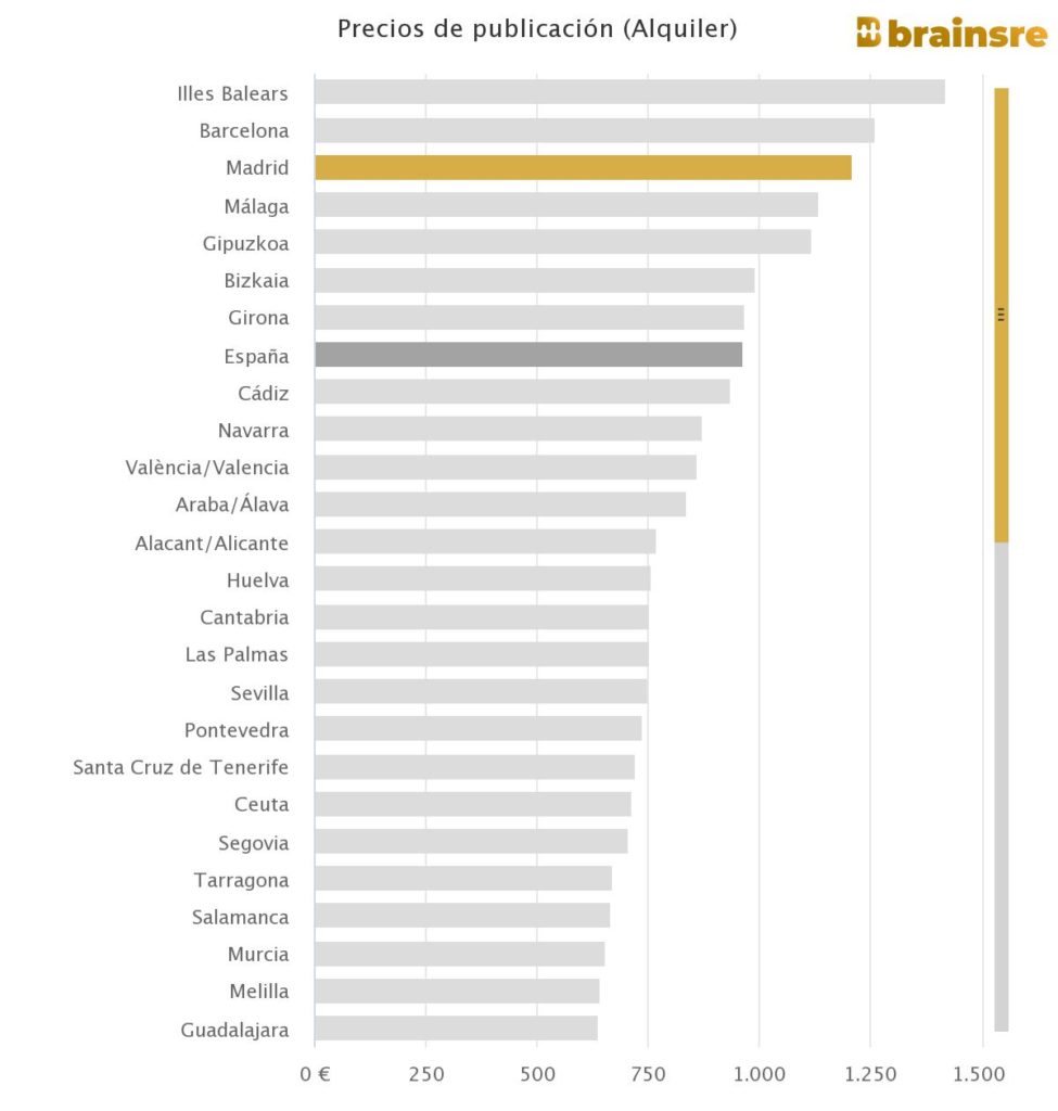 Si l’on se concentre sur les capitales, que ce soit dans la communauté autonome ou la province, en plus de Ceuta et Melilla, les prix de publication varient d’une moyenne de 433 euros par mois à Ciudad Real à 1.310 euros à Barcelone [voir carte au début] .