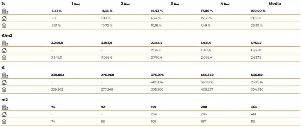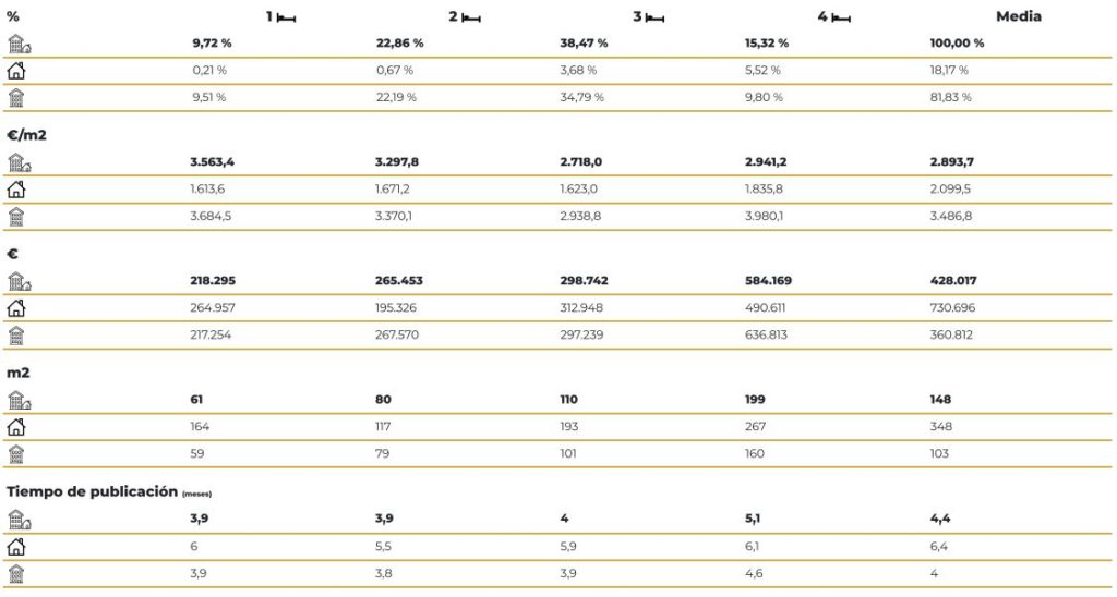 Le produit le plus proposé est aussi le plus abordable : le prix de vente d’un appartement est en moyenne de 360.812 euros, inférieur de 50,6 % à celui d’une maison (730.696 euros). Cependant, par zone, le prix du m2 d’un appartement dans la Communauté de Madrid est en moyenne de 3.486,8 euros, contre 2.099,5 euros du m2 de maison. En effet, la taille moyenne des appartements à Madrid était de 103 m2, contre 348 m2 pour les maisons.