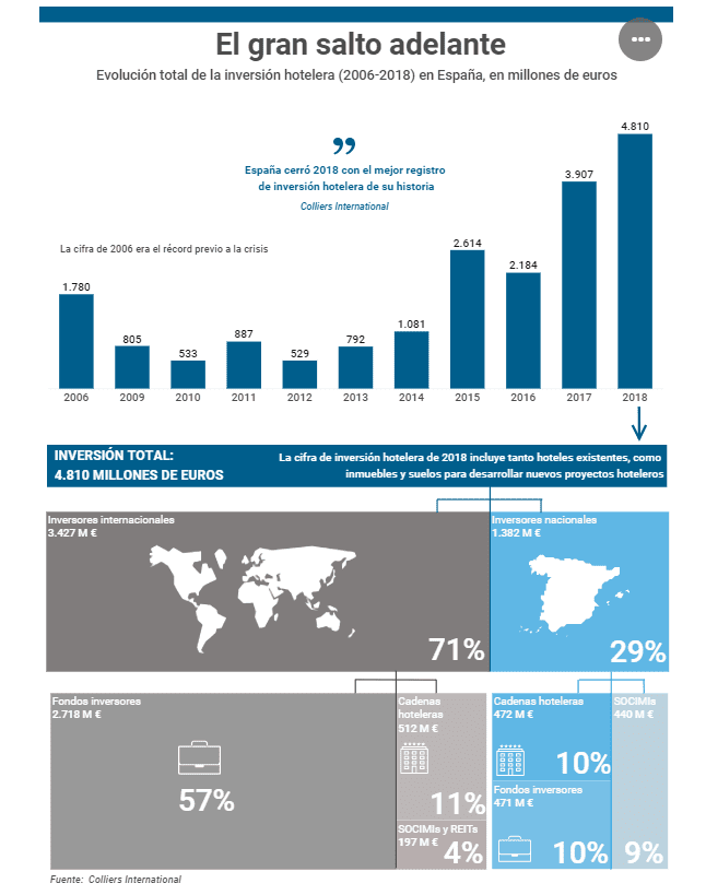 Les fonds d’investissement et les Socimis ont redoublé leur engagement dans le secteur du tourisme espagnol ces dernières années et contribuent à sa transformation de manière radicale, principalement dans l’hôtellerie. (Hosteltur)