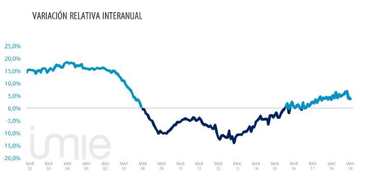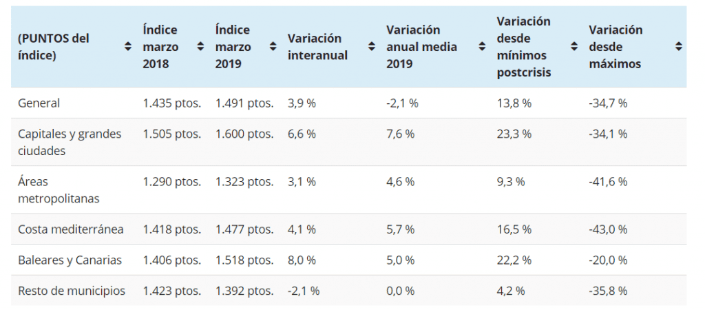 L‘ Indice Général reste à 1,491 points en mars, une donnée similaire à celle de février. L’étude révèle une croissance de 3,9% entre mars 2018 et mars 2019. Par rapport au minimum enregistré en février 2015, la valeur moyenne du logement en Espagne a augmenté de 13,8% et est inférieure au maximum recensé en 2007 de 34,7%.
