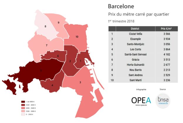 Alors qu’elle était devancée au dernier trimestre 2017 par San Sébastien, Barcelone redevient la capitale la plus chère au début 2018 avec en moyenne un prix au mètre carré de 3 174 €. San Sébastien est donc deuxième ce trimestre, avec 3 165 euros par mètre carré, et Madrid est troisième, 2 699 euros par mètre carré.