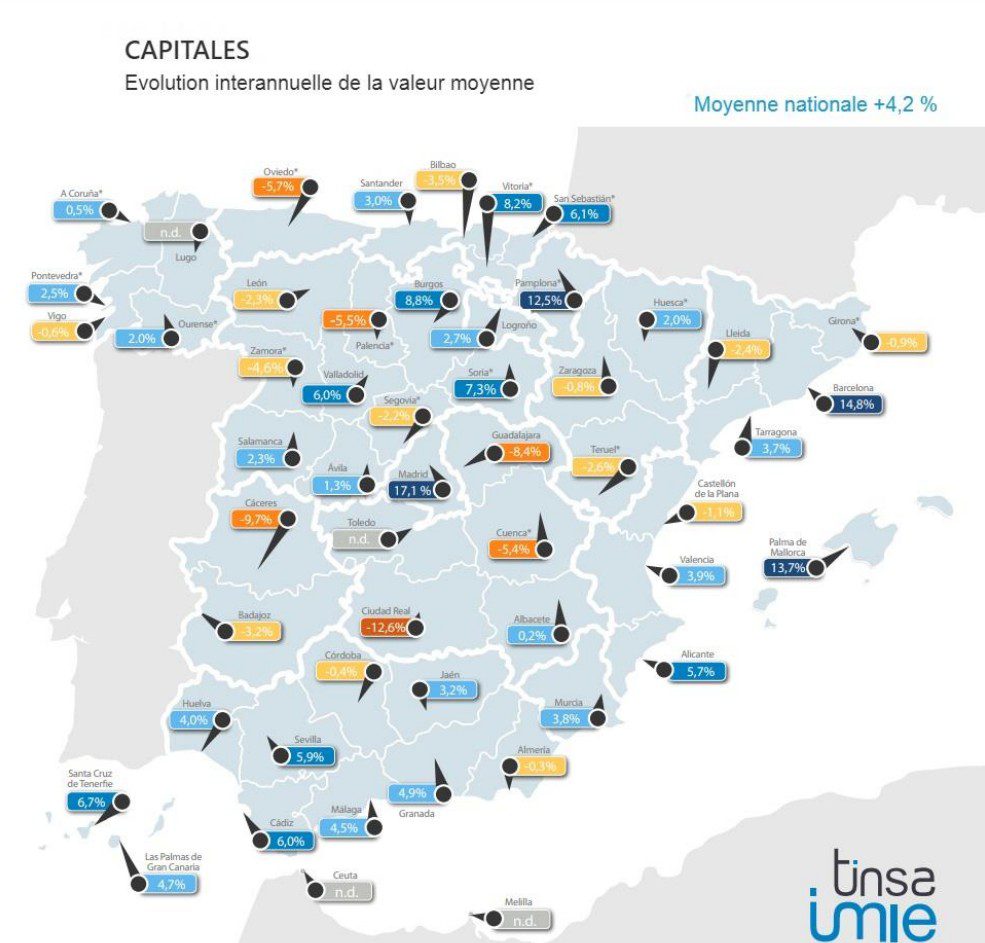 Madrid, Barcelone et Palma de Majorque font partie des capitales où la hausse des prix entre 2016 et 2017 au quatrième trimestre est supérieure à 5 %. C’est également le cas dans dix autres villes d’Espagne en tête desquelles Pampelune avec une hausse de 12,5%. Les autres villes concernées par ces augmentations sont Burgos (+8,8%), Vitoria (+8,2%), Soria (+7,3%), Santa Cruz de Tenerife (+6,7%) et San Sébastien (+6,1%).