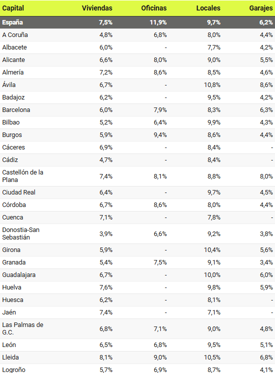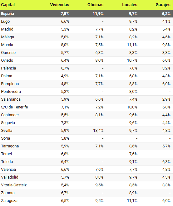 Les rendements les plus élevés sont obtenus à Séville (13,4%), Saragosse (9,5%), Vitoria (9,5%), Burgos (9,4%) et Lleida (9%). Les rendements à Valladolid (8,8%), Cordoue (8,6%), Almeria (8,6%), Santander (8,1%), Castellon de la Plana (8,1%), Alicante et Oviedo (8% dans les deux villes) sont également inférieurs à 9%. À Barcelone, il s’élève à 7,9%, tandis qu’à Madrid, il est de 7,7%.